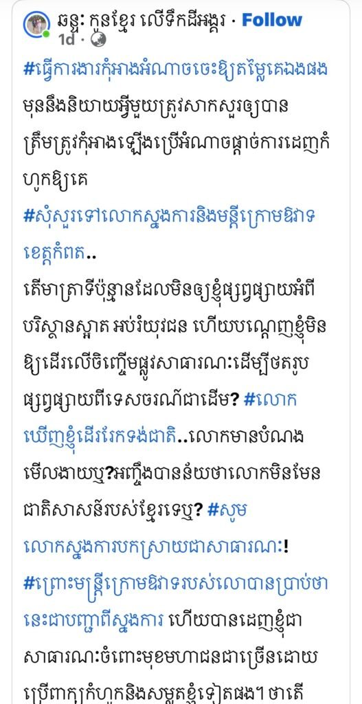 ខេត្តកំពត៖ លោកឧត្តមសេនីយ៍ទោ ម៉ៅ ចន្ទ័មធុរិទ្ធ ស្នងការខេត្តកំពត ៖ សុំទោសបងប្រុស បងប្រុសប្រើពាក្យថាស្នងការខេត្តកំពត ដេញបងមិនអោយដើរ កុំអោយថតអំពីការផ្សព្វផ្សាយរបស់បង ! បងនិយាយបែបនេះបានន័យថាខ្ញុំជាអ្នកដេញបងហើយ ទាំងដែរខ្ញុំមិនបានដឹងអំពីបញ្ហារបស់បង ! ចំពោះខ្ញុំ ខ្ញុំរីករាយណាស់និងសូមអរគុណជាខ្លាំងចំពោះការផ្សព្វផ្សាយអំពីខេត្តរបស់ខ្ញុំ តែខ្ញុំខ្លាចថាមន្ត្រីរបស់ខ្ញុំគាត់ឃើញសម្ភារៈដែលបងស្ពាយមកជាមួយនេះវាប៉ៈពាល់ទៅនឹងសណ្តាប់ឬក៏វាប៉ៈពាល់ទៅនឹងអ្នកទេសចរណ៏ផ្សេងៗទៀតទើបមានបញ្ហាបែបនេះកើតឡើង ។ ខ្ញុំសូមបញ្ជាក់សារជាថ្មី ថាខ្ញុំមិនបានបញ្ជាកំលាំងអោយដេញបងនោះទេ បងប្រើភាសារនិងការសរសេរនេះគឺសាធារណៈជនគាត់គិតថាខ្ញុំជាអ្នកប្រើកូនចៅអោយដេញបងហើយ ហើយករណីនេះខ្ញុំនឹងហៅមន្ត្រីរបស់ខ្ញុំ និងប្រជាការពារនៅទីនោះ មកសាកសួរទាំងអស់ ដើម្បីរកយុត្តធម៏ជូនបង ។