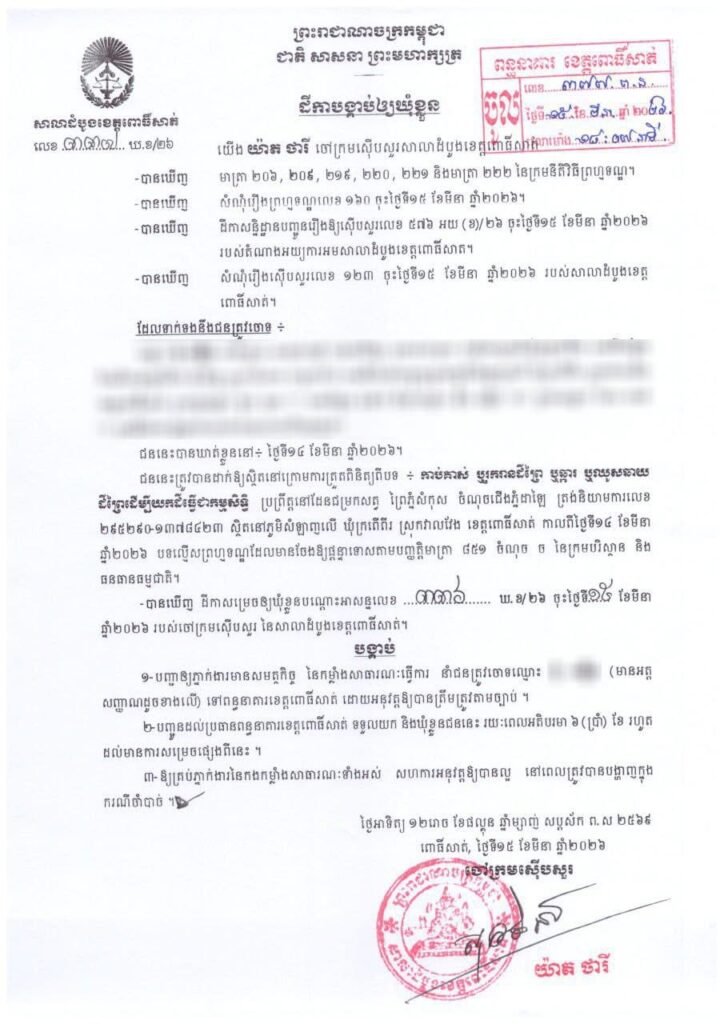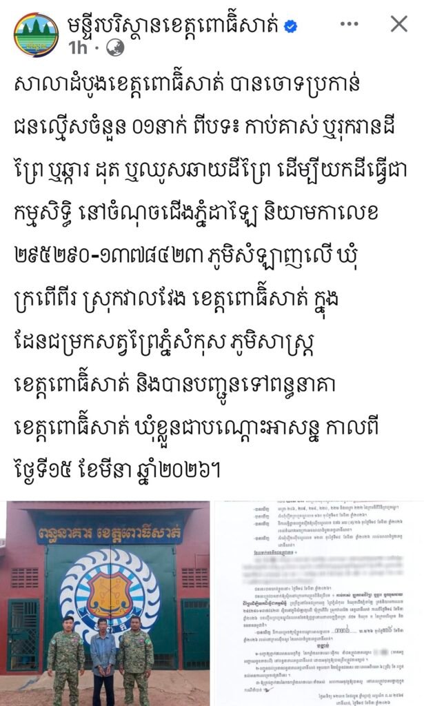 សាលាដំបូងខេត្តពោធិ៍សាត់ បានចោទប្រកាន់ជនល្មើសចំនួន ០១នាក់ ពីបទ៖ កាប់គាស់ ឬរុករានដីព្រៃ ឬឆ្ការ ដុត ឬឈូសឆាយដីព្រៃ ដើម្បីយកដីធ្វើជាកម្មសិទ្ធិ នៅចំណុចជើងភ្នំដាឡៃ និយាមកាលេខ ២៩៥២៩០-១៣៧៨៤២៣ ភូមិសំឡាញលើ ឃុំក្រពើពីរ ស្រុកវាលវែង ខេត្តពោធិ៍សាត់ ក្នុងដែនជម្រកសត្វព្រៃភ្នំសំកុស ភូមិសាស្ត្រខេត្តពោធិ៍សាត់ និងបានបញ្ជូនទៅពន្ធនាគាខេត្តពោធិ៍សាត់ ឃុំខ្លួនជាបណ្តោះអាសន្ន កាលពីថ្ងៃទី១៥ ខែមីនា ឆ្នាំ២០២៦។
