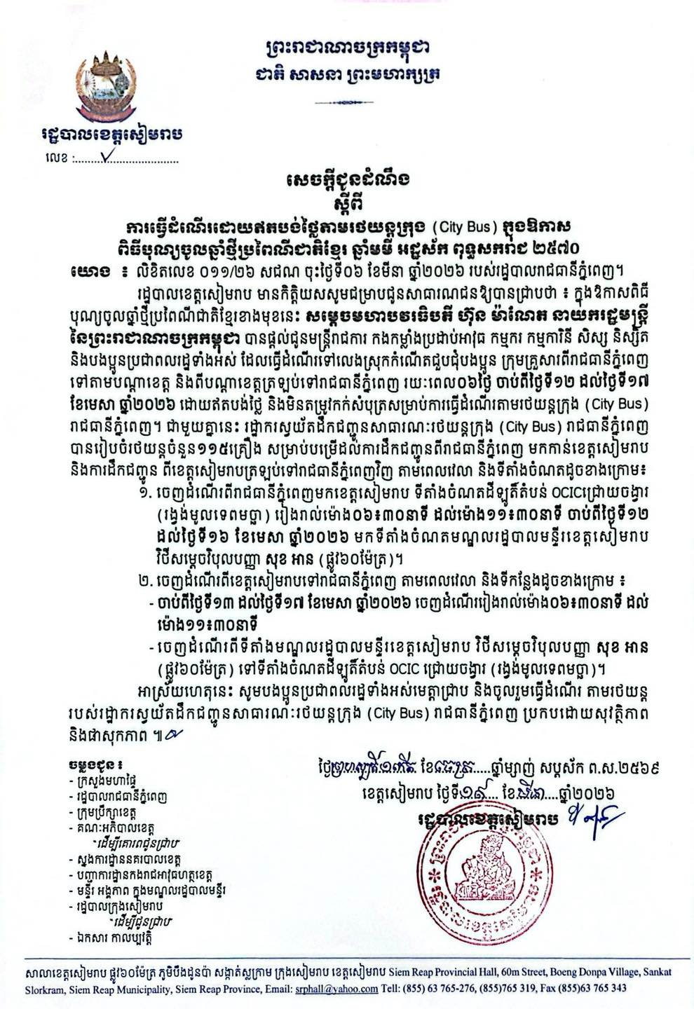 រដ្ឋបាលខេត្តសៀមរាប ជូនដំណឹងស្តីពីការធ្វើដំណើរដោយឥតបង់ថ្លៃតាមរថយន្តក្រុង (City Bus) ក្នុងឱកាសពិធីបុណ្យចូលឆ្នាំថ្មីប្រពៃណីជាតិខ្មែរ ឆ្នាំមមី អដ្ឋស័ក ពុទ្ធសករាជ ២៥៧០ រយៈពេល០៦ថ្ងៃ ចាប់ពីថ្ងៃទី១២ ដល់ថ្ងៃទី១៧ ខែមេសា ឆ្នាំ២០២៦។