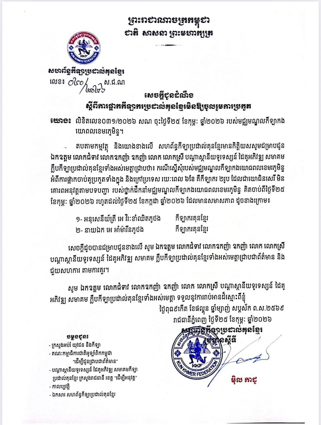 ព័ត៌មានកីឡា ធ្ងន់បាត់! កីឡាករ ល្បី២រូប ត្រូវ សហព័ន្ធកីឡាប្រដាល់គុនខ្មែរ ផ្អាក ការប្រកួត កន្លះឆ្នាំ…! TNN NEWS (Admin) February 25, 2026 0 កីឡា ៖ សហព័ន្ធកីឡាប្រដាល់គុនខ្មែរ ចេញសេចក្តីជូនដំណឹង ផ្អាក កីឡាករ ២រូប មិនអោយប្រកួត៦ខែ @timelynewsnetwork About the Author TNN NEWS (Admin) Administrator View All Posts Post navigation Previous: លោក Tommy Kim ៖ ឆ្លើយតបភ្លាមៗ ក្រោយ…!Next: សហព័ន្ធកីឡាប្រដាល់សកលកម្ពុជា និងក្រុមហ៊ុន វឌ្ឍនៈ បានចុះអនុស្សរណៈ MOU រួចហើយ! Leave a Reply Cancel replyYour email address will not be published. Required fields are marked *Comment * Name * Email * Website Save my name, email, and website in this browser for the next time I comment. ព័ត៌មានពាក់ព័ន្ធ ព័ត៌មានកីឡា វី អាកទីវ អារាម គុនខ្មែរ សប្តាហ៍នេះ រៀបចំ ជាពិេសេស សំរាប់ បងប្អូន ជនភៀសសឹក នៅខេត្តព្រះវិហារ និង ខេត្តសៀមរាប! TNN NEWS (Admin) March 23, 2026 0 ព័ត៌មានកីឡា ដើម្បី អបអរសាទរ ពិធីបុណ្យចូលឆ្នាំថ្មី ប្រពៃណីជាតិ ខាងមុខ ក្រុមហ៊ុន វឌ្ឍនៈប្រ៊ូវើរី ឧបត្ថម្ភ ភេសជ្ជៈ ១៥០០ កេស ដល់ រដ្ឋបាលខេត្តសៀមរាប! TNN NEWS (Admin) March 18, 2026 0 ព័ត៌មានកីឡា មេទ័ពធំគុនខ្មែរទាំង៣ តើអ្នកណា នឹងក្លាយជាអធិរាជនៃព្រឹត្តិកាណ៍ Three Kingdoms? TNN NEWS (Admin) March 7, 2026 0
