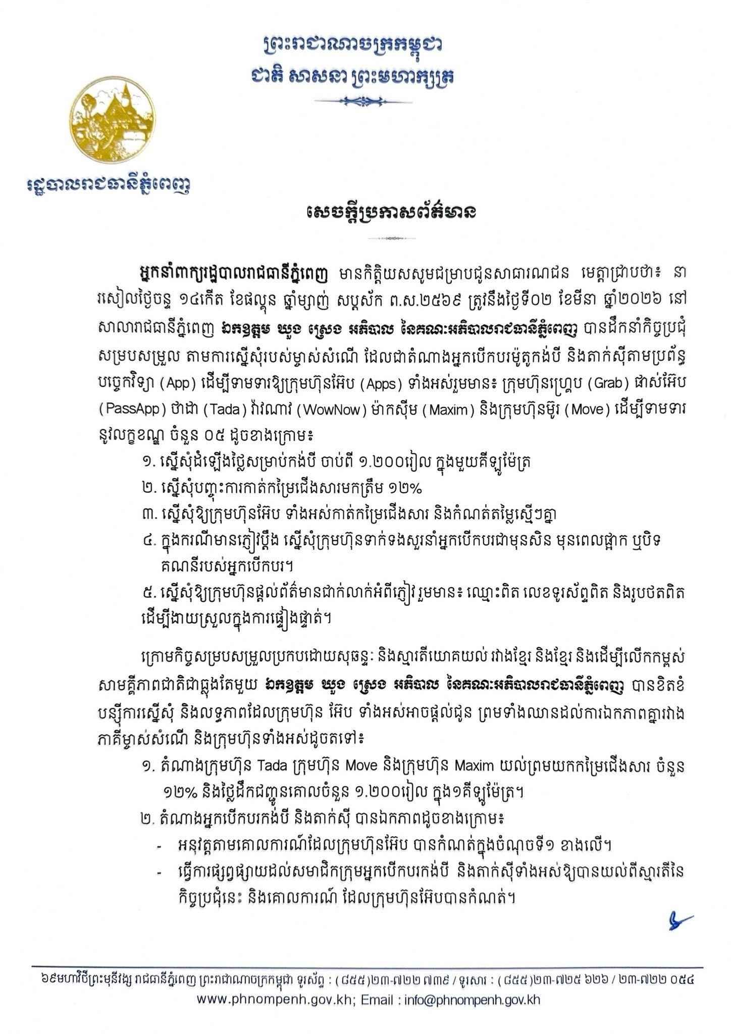 ភ្នំពេញ៖ យោងតាមសេចក្តីប្រកាសព័ត៌មាន ស្តីពីលទ្ធផល នៃការសម្របសម្រួល ការស្នេីសុំ របស់តំណាងអ្នកបេីកបរកង់បី និងតាក់ស៊ី ចំពោះ ក្រុមហ៊ុន អ៊ែប នានា ឱ្យបន្ធូរបន្ថយ កម្រៃជេីងសារ និងកំណត់អត្រាតម្លៃគោលក្នុងការដឹកជញ្ជូន មានខ្លឹមសារលម្អិតដូចខាងក្រោម៖