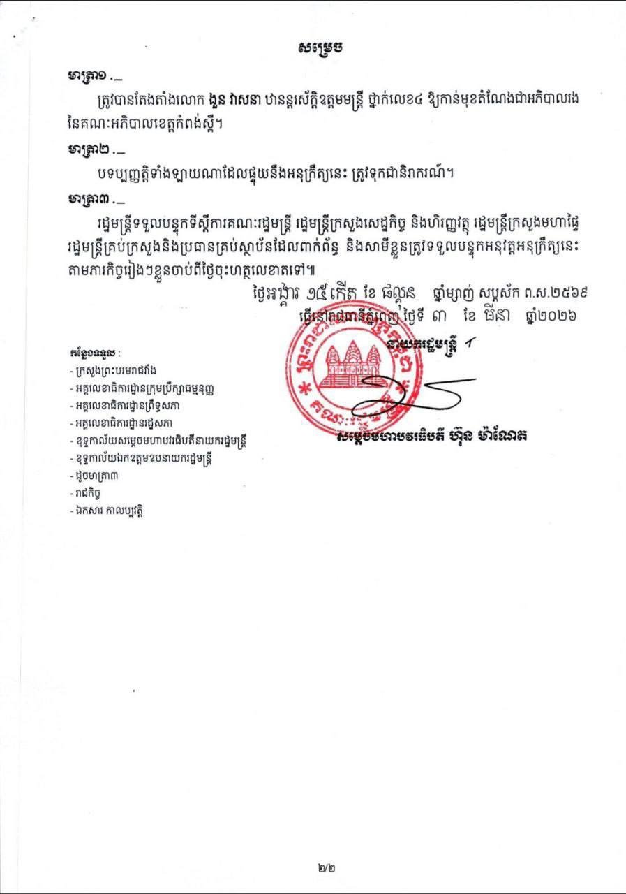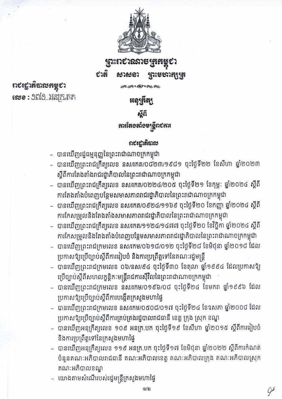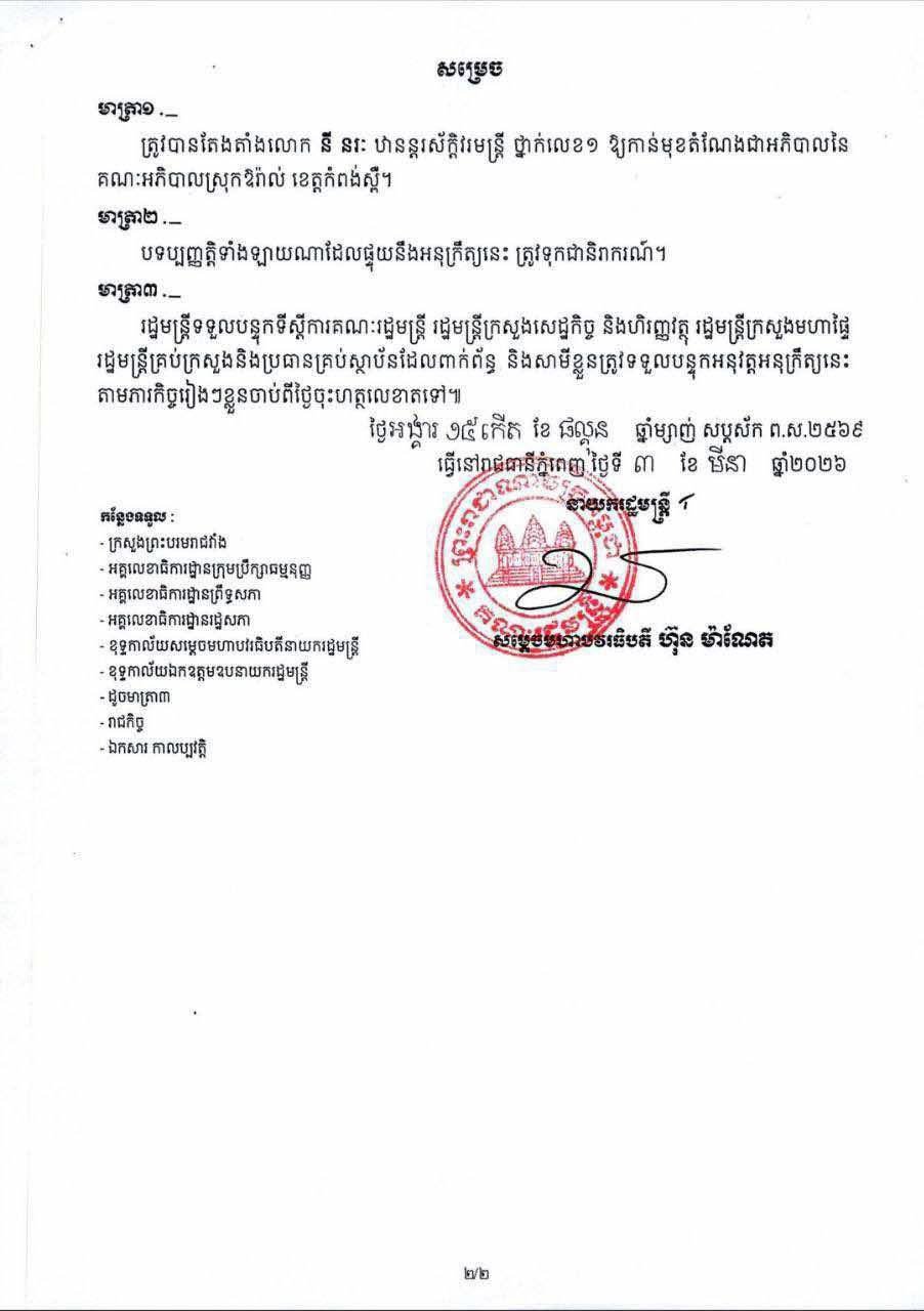 ព័ត៌មានជាតិ តែងតាំង លោក នី នរៈ ជា អភិបាលស្រុកឱរ៉ាល់ ជំនួស លោក ងួន វាសនា….! TNN NEWS (Admin) March 7, 2026 0 ភ្នំពេញ ៖ រាជរដ្ឋាភិបាល ចេញអនុក្រិត្យ តែងតាំង លោក នី នរៈ ជាអភិបាលស្រុកឱរ៉ាល់ ខណៈ លោក ងួន វាសនា ត្រូវបានតែងជាអភិបាលរង នៃគណអភិបាលខេត្តកំពង់ស្ពឺ។ @timelynewsnetwork About the Author TNN NEWS (Admin) Administrator View All Posts Post navigation Previous: ក្រសួងបរិស្ថាន បញ្ជាឱ្យមន្ទីរបរិស្ថានរាជធានី/ខេត្ត ពិនិត្យទីតាំងស្តុកសំណល់អេតចាយទូទាំងប្រទេស បន្ទាប់ពីរកឃើញទីតាំងខុសច្បាប់មួយកន្លែងឆេះបង្កការបំពុលNext: អភិបាលខេត្តកំពង់ចាម ស្នេីដល់ ស្ត្រីខ្មែរ គ្រប់រូប បង្កើនឆន្ទៈមុតស្រួច ក្នុងការវិវត្តន៍លូតលាស់ ជាមួយប្រាជ្ញា និងបទពិសោធ ឈរលើគន្លងផ្លូវគតិបណ្ឌិត Leave a Reply Cancel replyYour email address will not be published. Required fields are marked *Comment * Name * Email * Website Save my name, email, and website in this browser for the next time I comment. ព័ត៌មានពាក់ព័ន្ធ ព័ត៌មានជាតិ លោក ប៉ែន បូណា ៖ របាយការណ៍ ស្តីពី ការខូចខាត ប្រាសាទព្រះវិហារ ដោយសារការវាយប្រហារប្រដាប់អាវុធ ពីសំណាក់ កងទ័ពថៃ ត្រូវបានលាតត្រដាង! TNN NEWS (Admin) March 23, 2026 0 ព័ត៌មានជាតិ អភិបាលខេត្តកណ្ដាល ៖ កងរាជអាវុធហត្ថ ទើបជ្រើសរើសថ្មី សូម សម្រួចចិត្ត និងខិតខំប្រឹងប្រែងដើម្បីស្វែងយល់ ពីបច្ចេកវិទ្យា ព្រោះ សង្គ្រាម បច្ចុប្បន្ន គឺជា សមរភូមិ បច្ចេកវិទ្យា! TNN NEWS (Admin) March 23, 2026 0 ព័ត៌មានជាតិ ពិធីសំណេះសំណាល និងជូនដំណើរ យោធិន នៃកងរាជអាវុធហត្ថ ថទើបជ្រើសរើសថ្មី(ជាប់ជាស្ថាពរ)ឲ្យចូលទៅហ្វឹកហ្វឺននៅវិទ្យាស្ថានកងរាជអាវុធហត្ថ(កំបូល) TNN NEWS (Admin) March 23, 2026 0