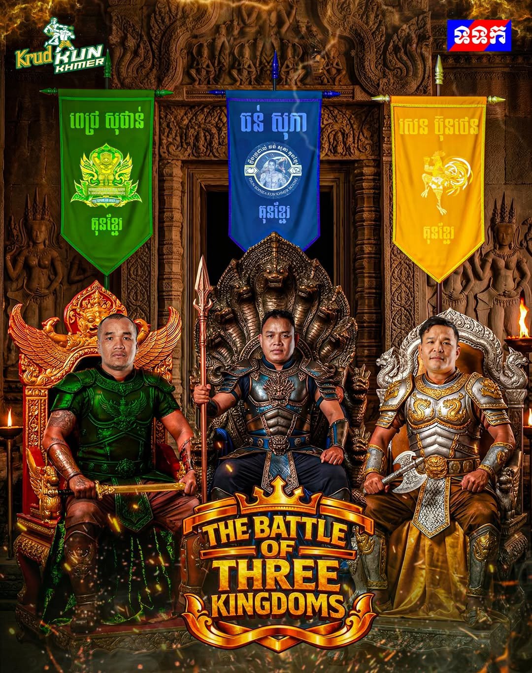 កីឡា៖ THE BATTLE OF THREE KINGDOMS សមរភូមិប្រយុទ្ធដ៏ធំបំផុតនៅលេីសង្វៀន រវាងក្រុម និងក្រុម ដែលដឹកនាំដោយមេទ័ពធំគុនខ្មែរទាំង ៣ នឹងមកដល់ឆាប់ៗនេះ!