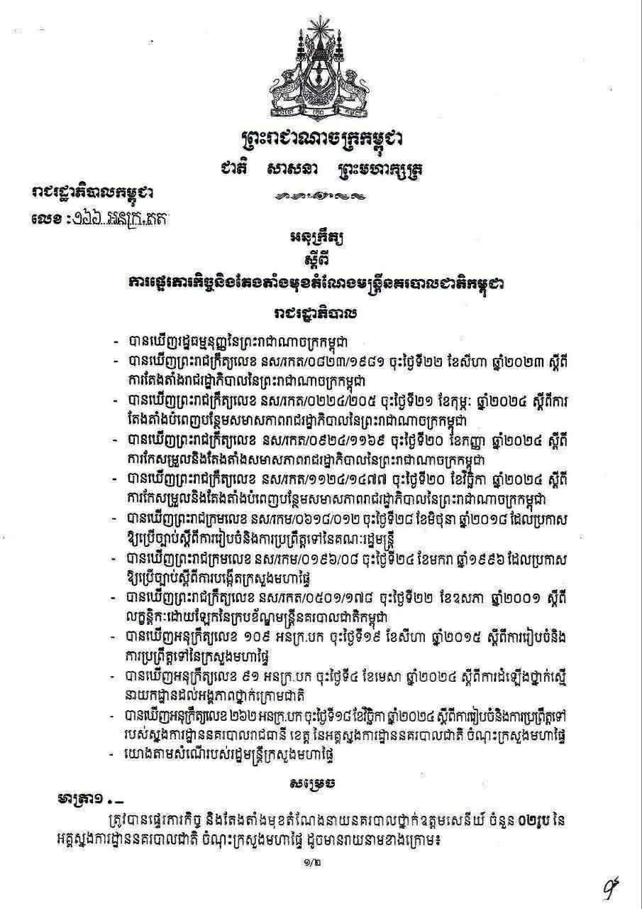 ភ្នំពេញ៖ សម្តេចធិបតី ហ៊ុន ម៉ាណែត នាយករដ្ឋមន្ត្រីកម្ពុជា ចេញអនុក្រិត្យ តែងតាំង លោក សឿម សារិទ្ធ ស្នងការរងនគរបាលបាត់ដំបង ជាស្នងការនគរបាលខេត្តបន្ទាយមានជ័យ។ ខណៈ លោក សិទ្ធិ ឡោះ ស្នងការនគរបាលខេត្តបន្ទាយមានជ័យ ត្រូវបានតែងតាំងជាអនុប្រធាននាយកដ្ឋានកណ្តាលនគរបាលយុត្តិធម៌។ ហើយពិធីប្រកាសចូលកាន់តំណែងនឹងធ្វើឡើងនៅព្រឹកថ្ងៃទី១១ ខែមីនា ឆ្នាំ២០២៦។